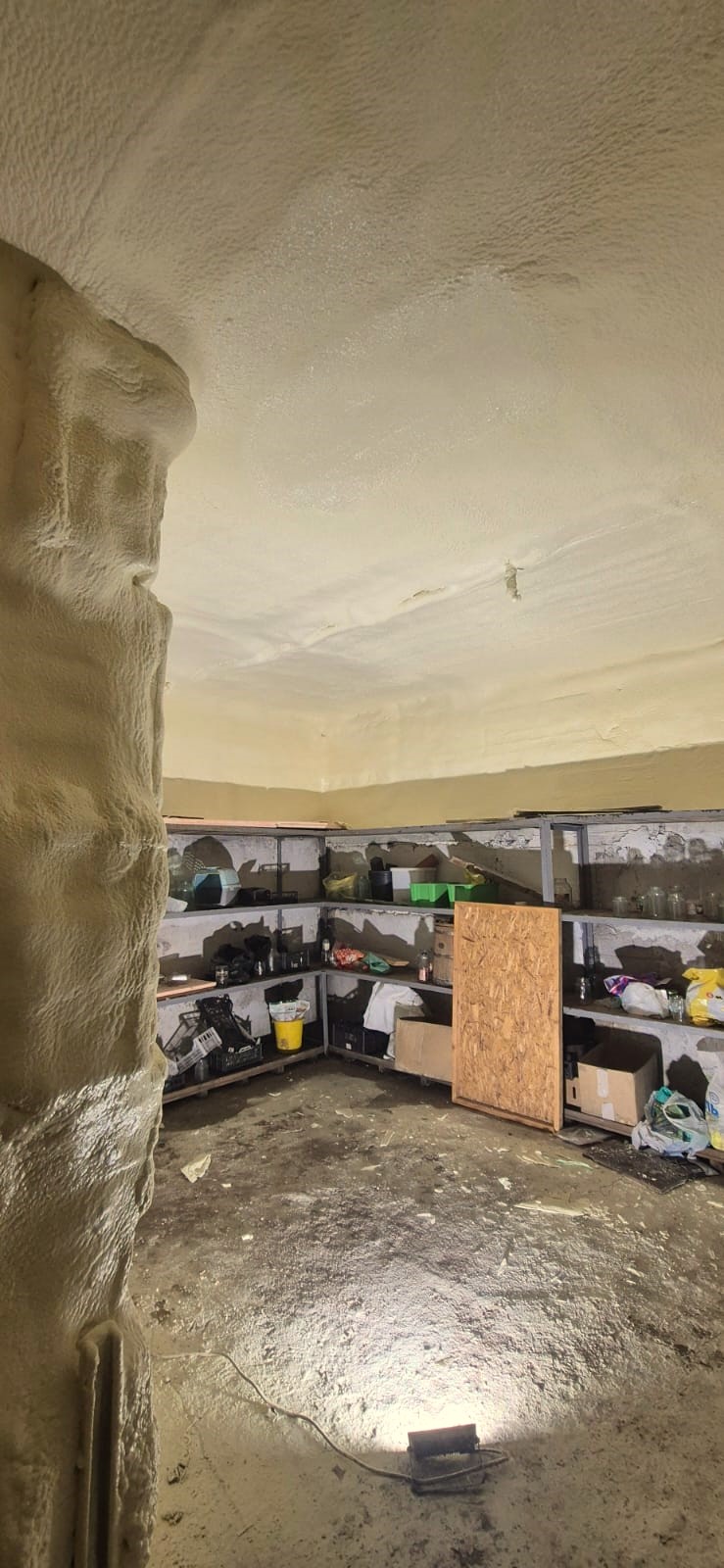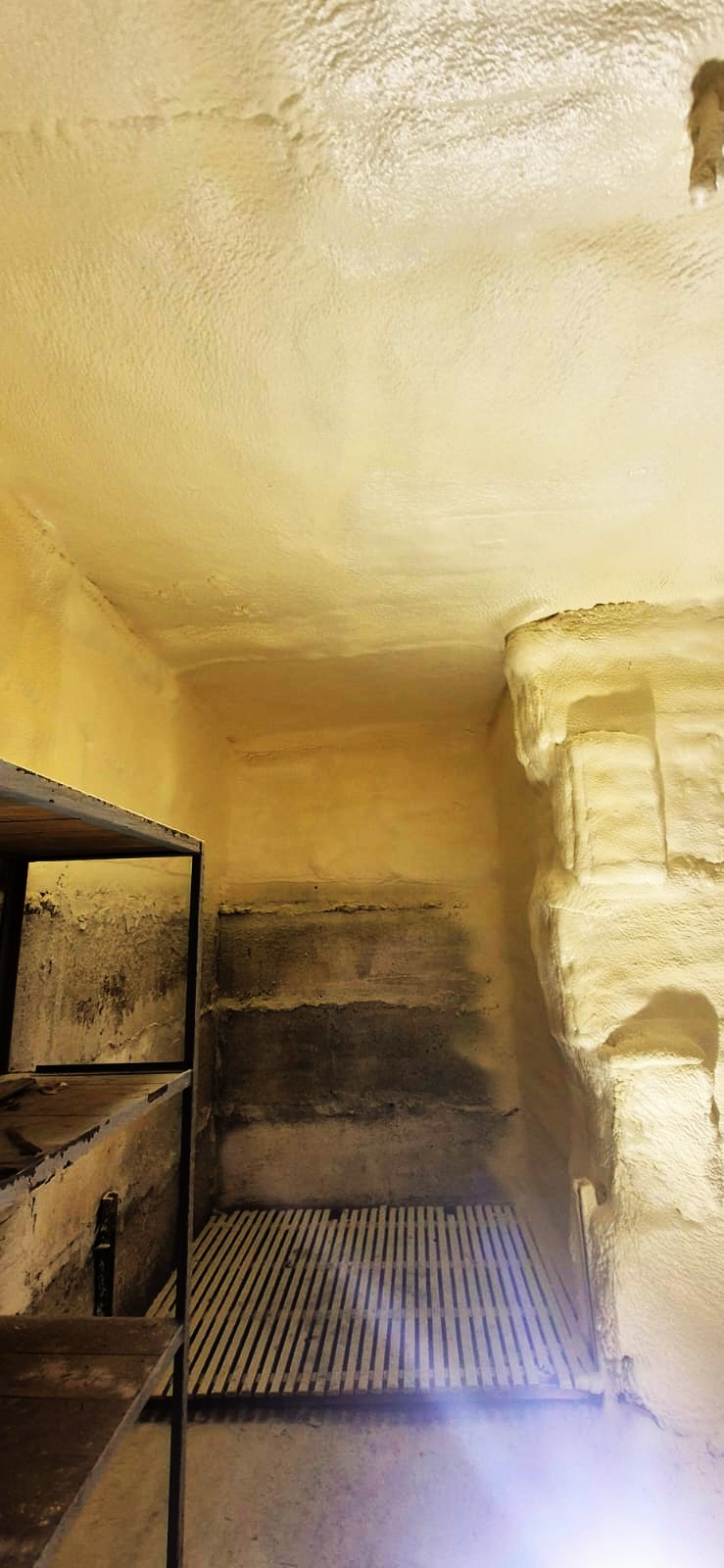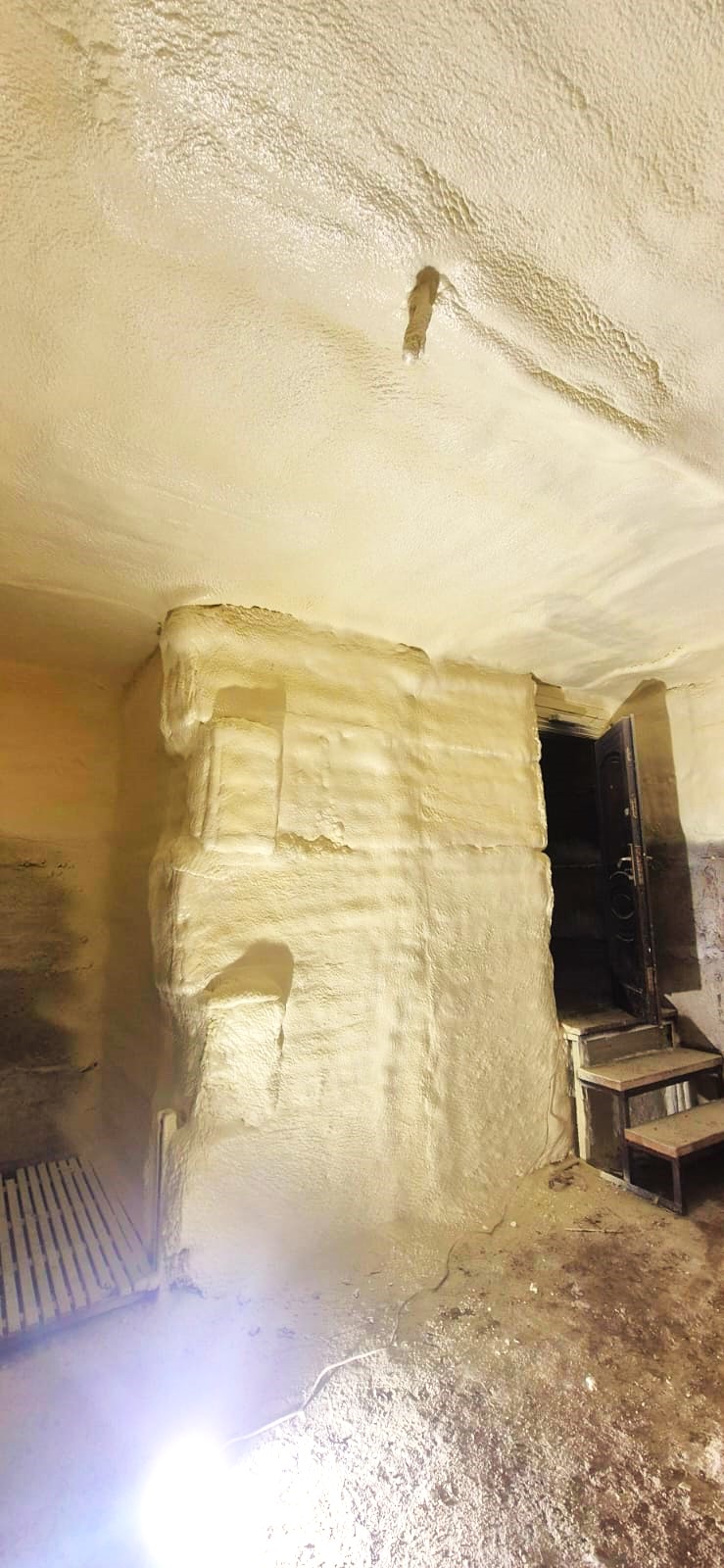 Утепление погреба проводилось для того, чтобы защитить внутреннее пространство от проникновения холода и влаги, а также образования конденсата и плесени. Плюс нам было необходимо улучшить эксплуатационные характеристики помещения и предотвратить его преждевременный износ. Для решения всех этих задач был выбран пенополиуретан жесткого типа с закрытой ячейкой. Вначале мы провели подготовительные работы. В частности, очистили поверхность стен и потолка от загрязнений, устранили неровности, щели и другие дефекты. Затем приступили непосредственно к нанесению ППУ с помощью оборудования высокого давления. Такая технология позволяет создавать равномерный герметичный бесшовный слой. На первом этапе мы распылили первый базовый слой, а после того как он затвердел — еще несколько слоев. Особое внимание при этом уделили углам, примыканием и проходам коммуникаций. За счет этого была достигнута эффективная теплоизоляция без образования мостиков холода.